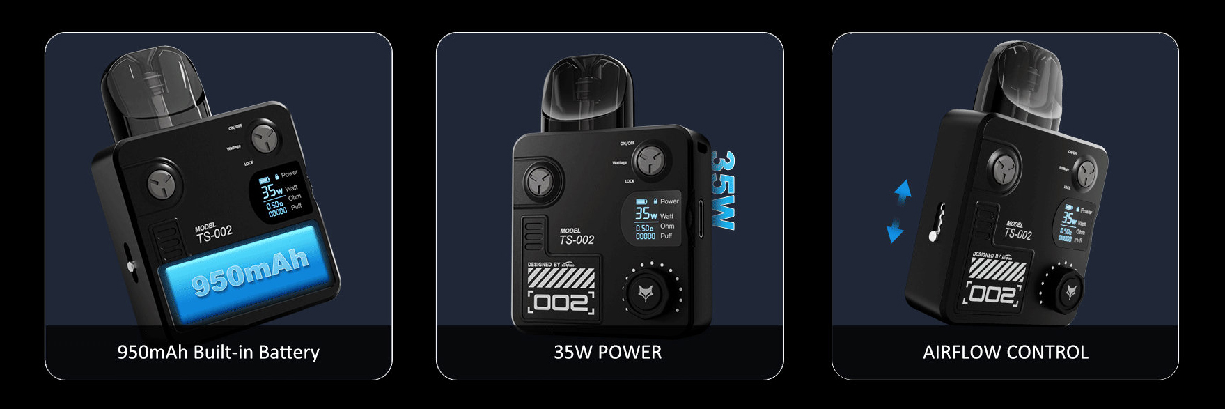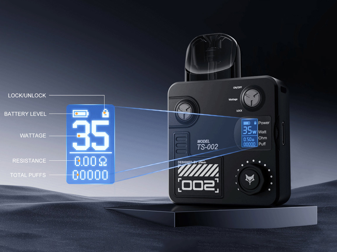 За тонкими алюминиевыми стенками скрывается вариативная плата с монохромным интерфейсом и регулируемой мощностью в пределах от 5 до 35 ватт. Активацию можно осуществлять не только нажатием кнопки, но и посредством затяжки. Кроме того, предусматривается настройка обдува. За питание отвечает неплохая батарея на 950 мАч с зарядкой через USB Type-C. Поддерживается пять видов сменных картриджей с разнообразными испарителями. Базовый набор ограничивается вариантом с намоткой на 0,8 Ом и стандартным резервуаром на 2 мл с боковой заправкой.