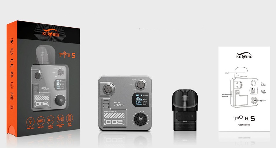 Компания Kumiho выпустила THOTH S Pod Kit. Это портативная под-система с регулируемой платой, дисплеем и оригинальным корпусом, который можно крутить как спинер.Устройство выполнили из легкого алюминиевого сплава в виде миниатюрного квадрата, который легко скрыть в ладони. Лицевую сторону снабдили универсальной кнопкой, дисплеем, декоративными вставками и спинером. На торце установили зарядный порт и маленькое колесо для настройки. Противоположную боковину перфорировали воздушным отверстием с ползунком. Один из верхних углов дополнили петлей для крепления темляка.